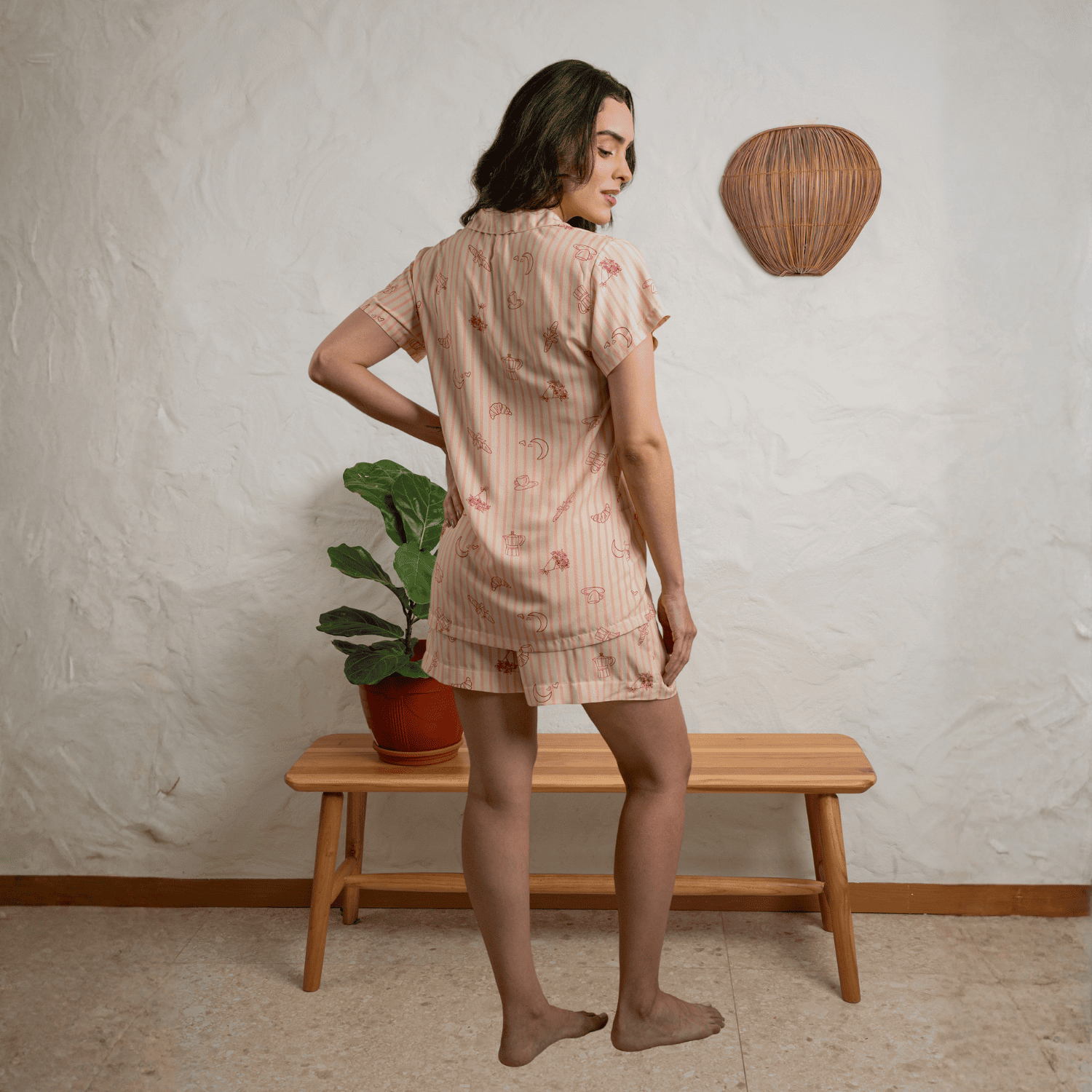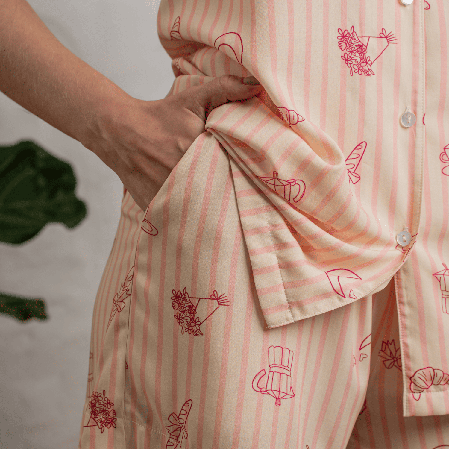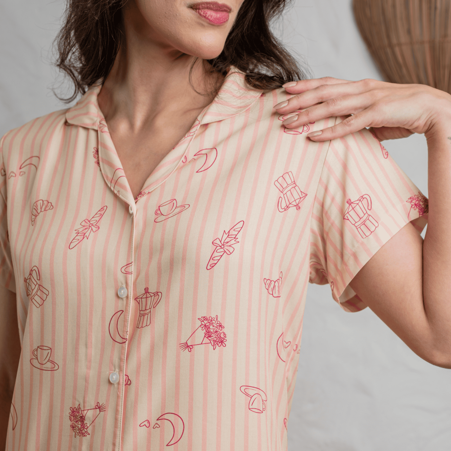 A blusa com gola clássica e botões na frente, torna esta peça super prática, podendo também ser usada para amamentação ou no pós cirúrgico. O design é complementado por uma estampa listrada e delicada com elementos que compõem um café da manhã pra lá de especial, como croissants, café e flores.