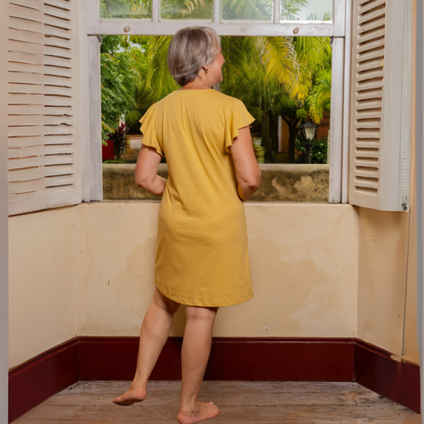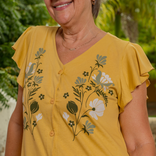 O modelo apresenta abertura frontal com botões, facilitando na hora de vestir e tornando-a extremamente prática, ideal para momentos como amamentação ou no pós-cirúrgico.