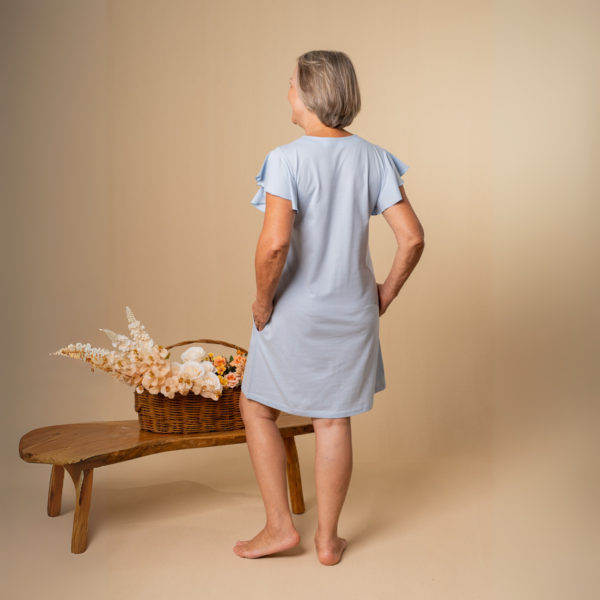 O modelo apresenta abertura frontal com botões, facilitando na hora de vestir e tornando-a extremamente prática, ideal para momentos como amamentação ou no pós-cirúrgico.