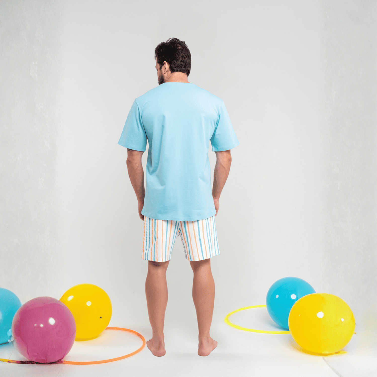 A blusa azul com gola em ribana, tem modelagem básica e confortável. O short com elástico no cós, garante um ajuste confortável e liberdade de movimento e é estampado com listras azuis e laranja, trazendo uma pegada moderna e divertida para a peça.