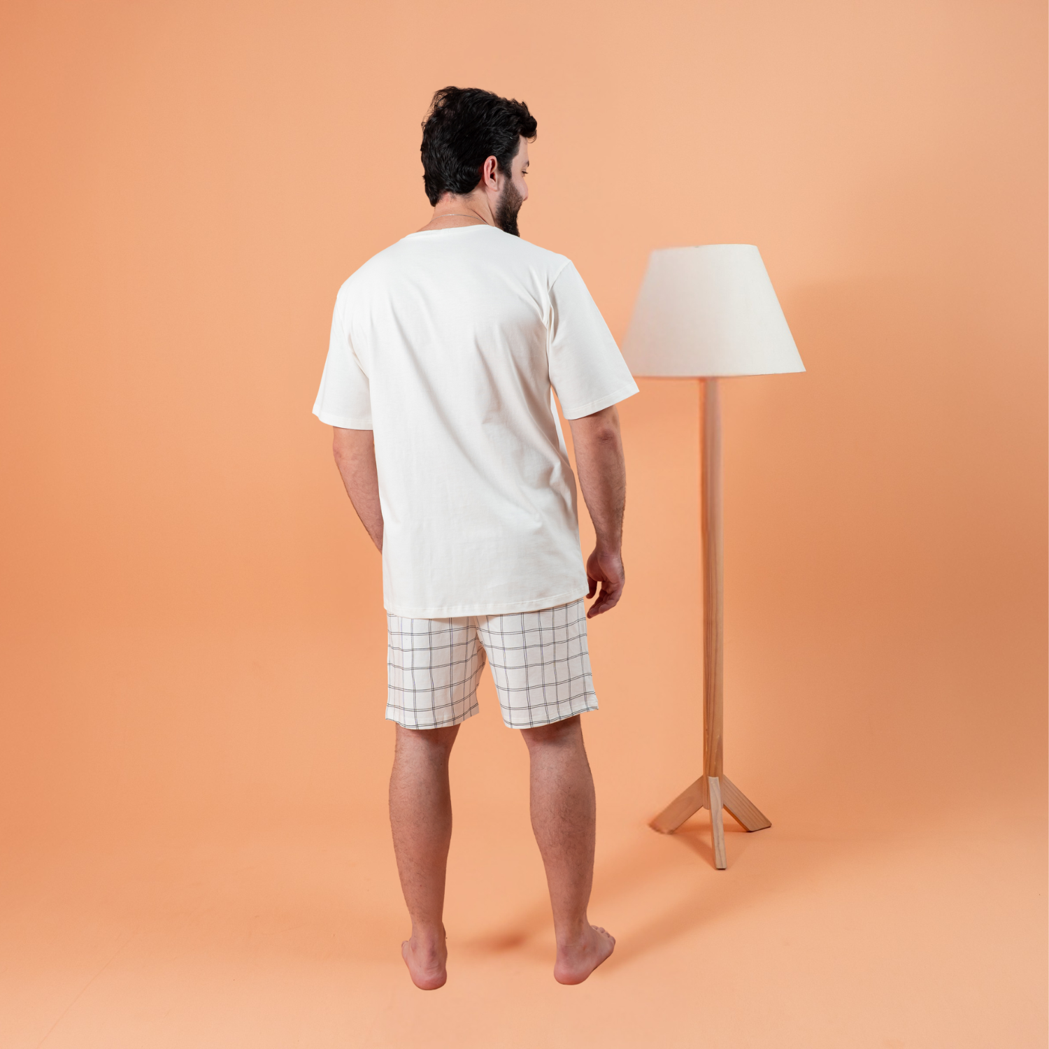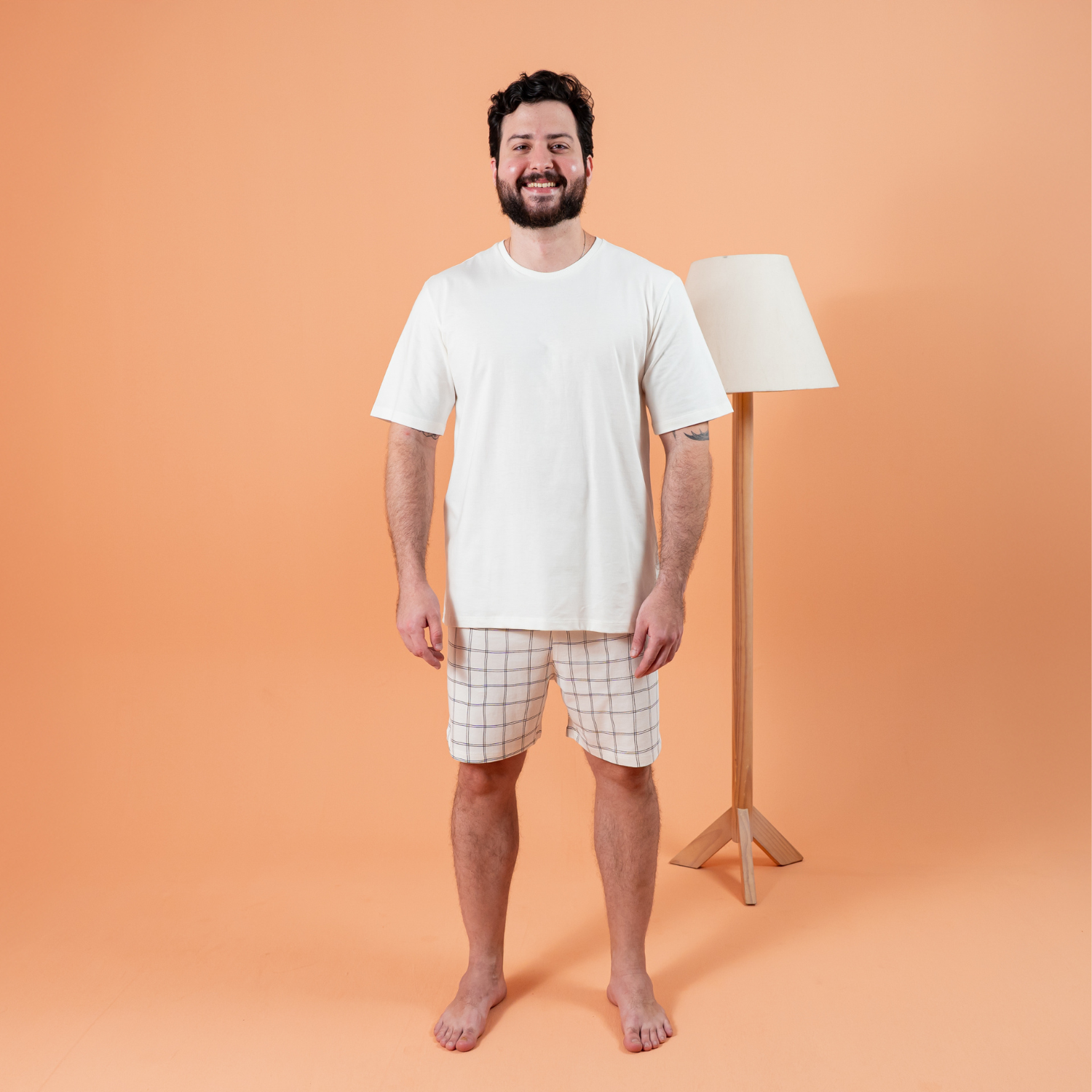 O conjunto é confeccionado em malha 100% algodão penteada, tornando esta peça confortável e gostosa de usar. O short é estampado com um quadriculado leve de listras fininhas bem minimalista e discreto..