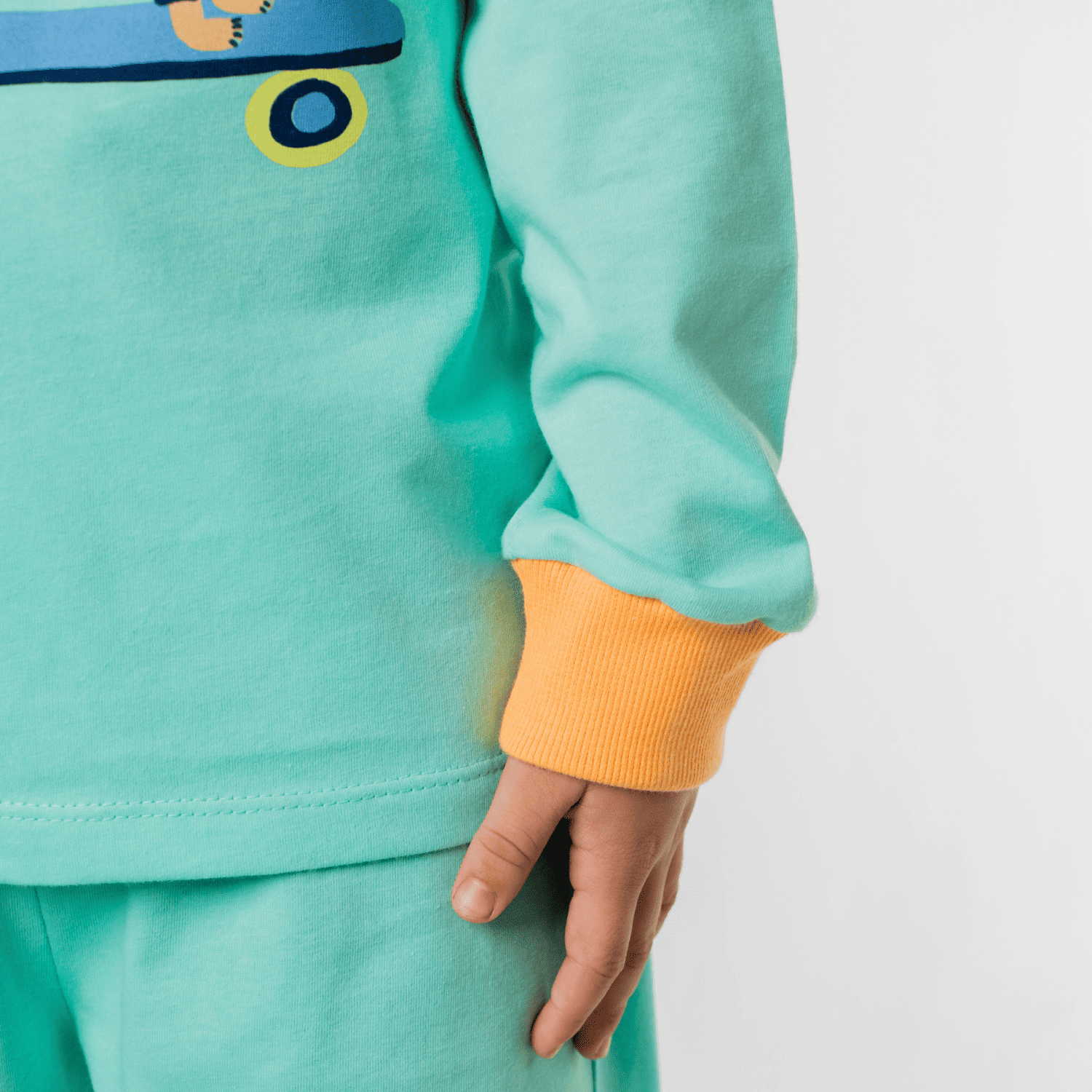 Esse pijama é perfeito para deixar as noites mais aconchegantes! Feito em malha 100% algodão penteada, super macia, ele vem com uma blusa verde água de mangas longas e detalhes coloridos em ribana na gola e nos punhos, estampada com um cachorrinho salsicha andando de skate, deixando a peça moderninha e divertida para os pequenos!