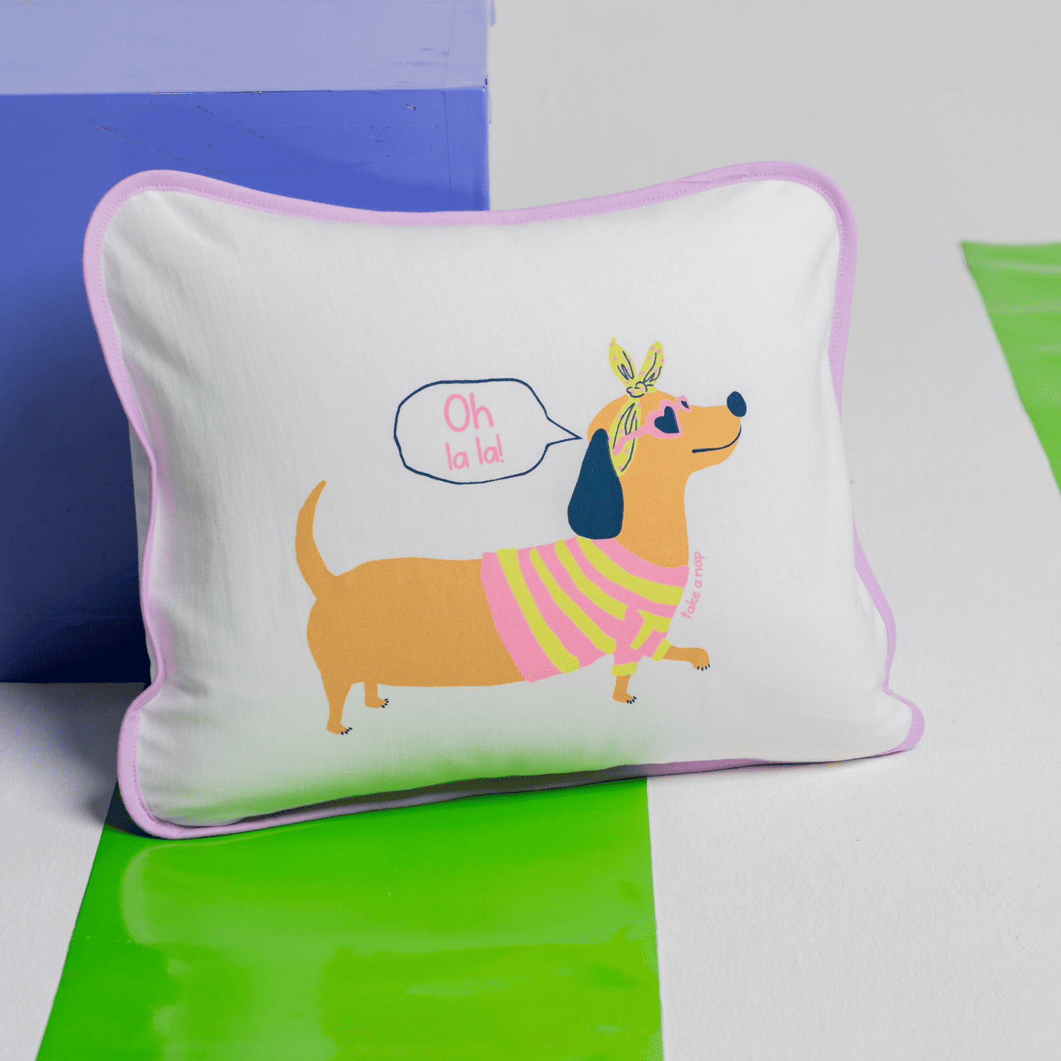 A fronha tem acabamento com víes lilás e vem com uma estampa fofíssima de uma cachorrinha salsicha exclusiva da coleção.