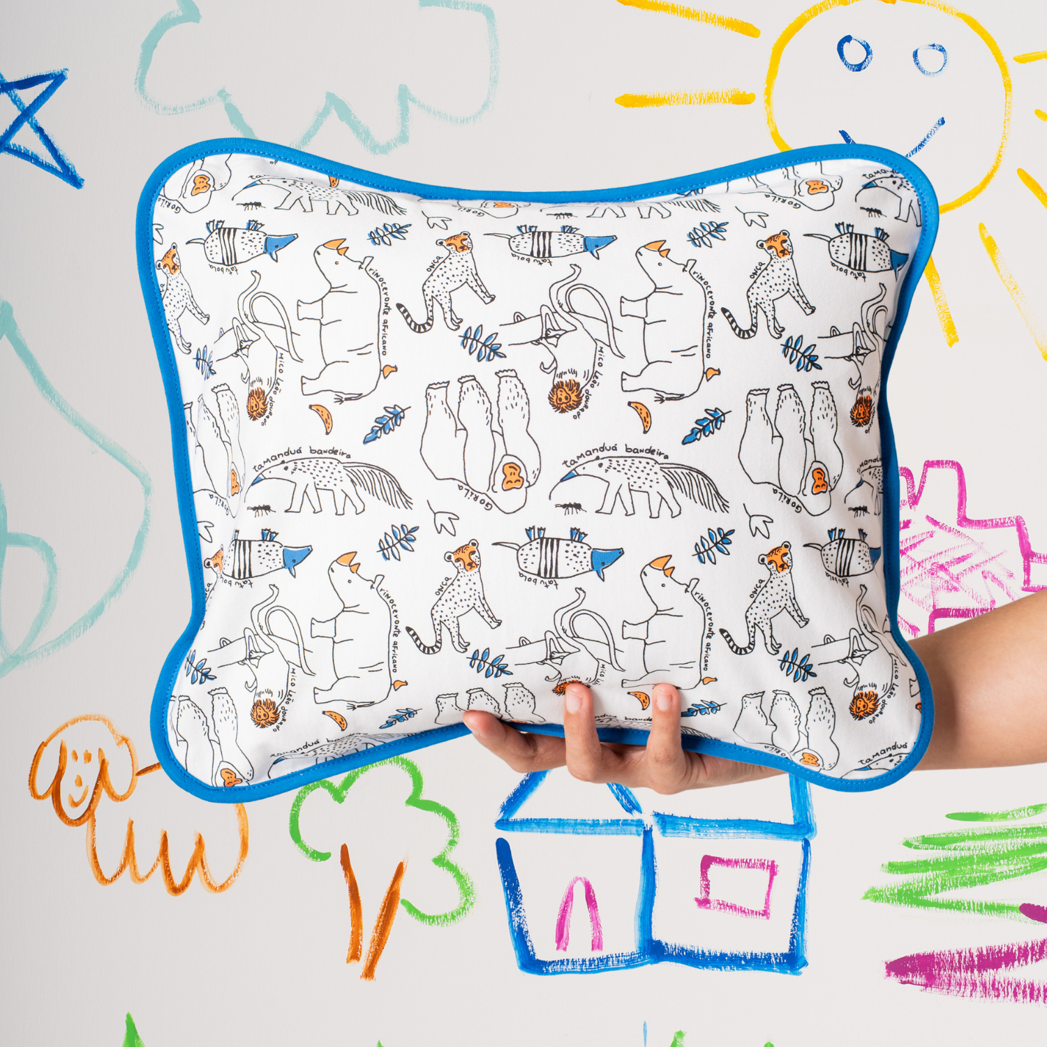 A fronha tem acabamento com víes azul e vem com uma estampa masculina exclusiva da coleção, que retrata os animais do Brasil que correm risco de extinção.